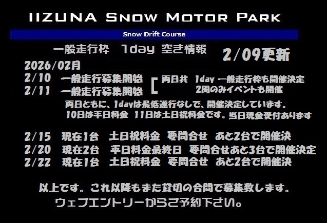 一般走行枠情報を再開しました。一般走行枠 空き情報 全てのエントリーができるウェブページを更新しました。ウェブで完結致します。ご利用ください。 飯綱スノーラリパーティの割引きエントリーが始まっています。